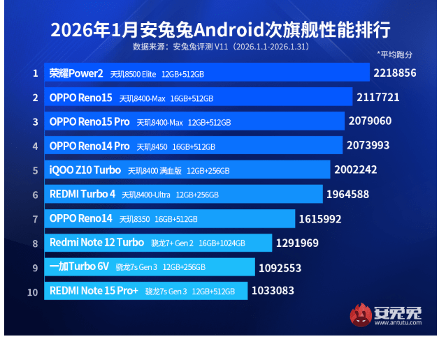 2026年1月のAndroidフラッグシップ機のAnTuTuスコアのランキングが公開されました。Snapdragon 8 Elite Gen 5搭載機とDimensity 9500搭載機がトップ10を独占しましたが、Snapdragon 8 Elite Gen 5搭載機が8機種ランクインしましたDimensity 9500搭載機でもAnTuTuスコア400万点超えのモデル(iQOO 15)が出てきました。