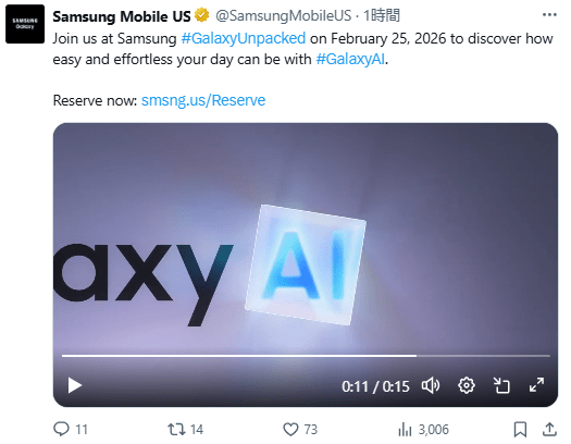 Galaxy S26シリーズの内、Galaxy S26とS26 Ultraは日本発表が有力視されます。Galaxy S25シリーズはGalaxy Unpackedでのグローバル発表と同時に日本発表がされたため、Galaxy S26 / S26 Ultraも2月25日に日本向け発表が期待されます。
