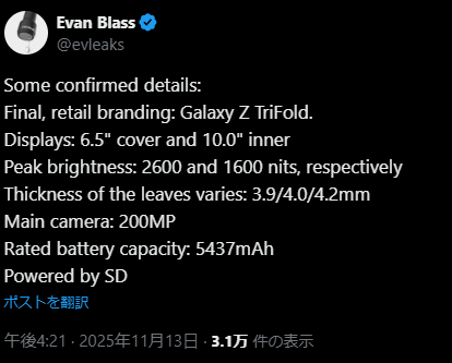 著名リーカーEvan Blass氏がサムスン三つ折り機Galaxy Z TriFoldのスペック概要をリークしました。三つ折り機には6.5インチのカバーディスプレイと10インチのインナーディスプレイが搭載されるようです。