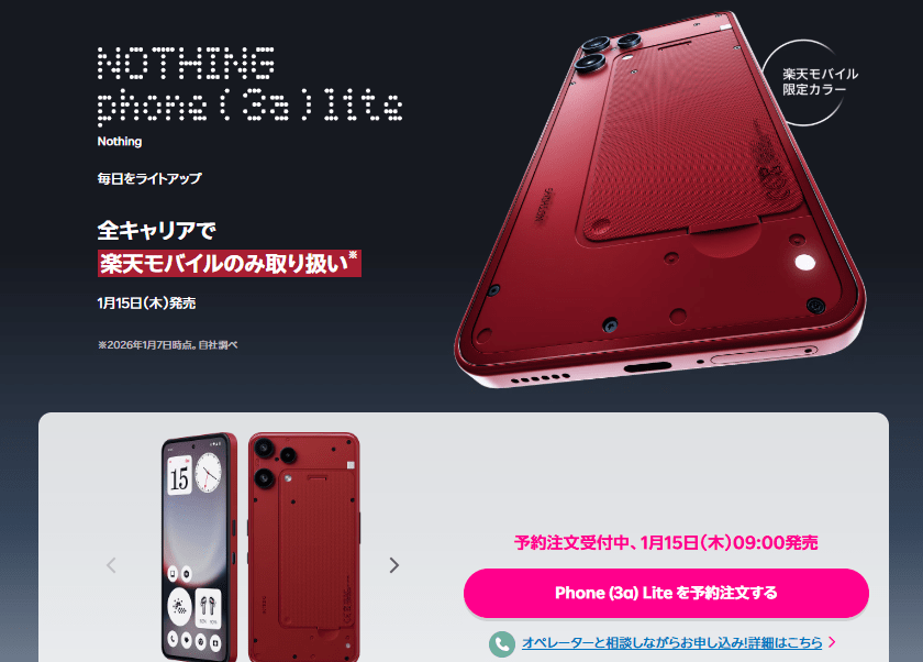 Nothing Phone (3a) Liteが1月15日に日本発売されます。公式価格は42,800円(CMF Phone 2 Proと同じ。)となります。楽天モバイルでも発売され、楽天モバイルでの価格は32,890円で、新規SIM契約やMNPで最大16,000の楽天ポイントが還元されます(つまり、Nothing公式サイト経由よりも楽天モバイル経由で購入したほうがお得になります。)