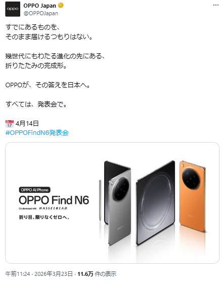 オウガジャパンは、OPPO Find N6の日本発売を公式予告しました。OPPO Find N6は3月17日にグローバル発表された横折りスマホです。日本向け発表イベントは4月14日となります。