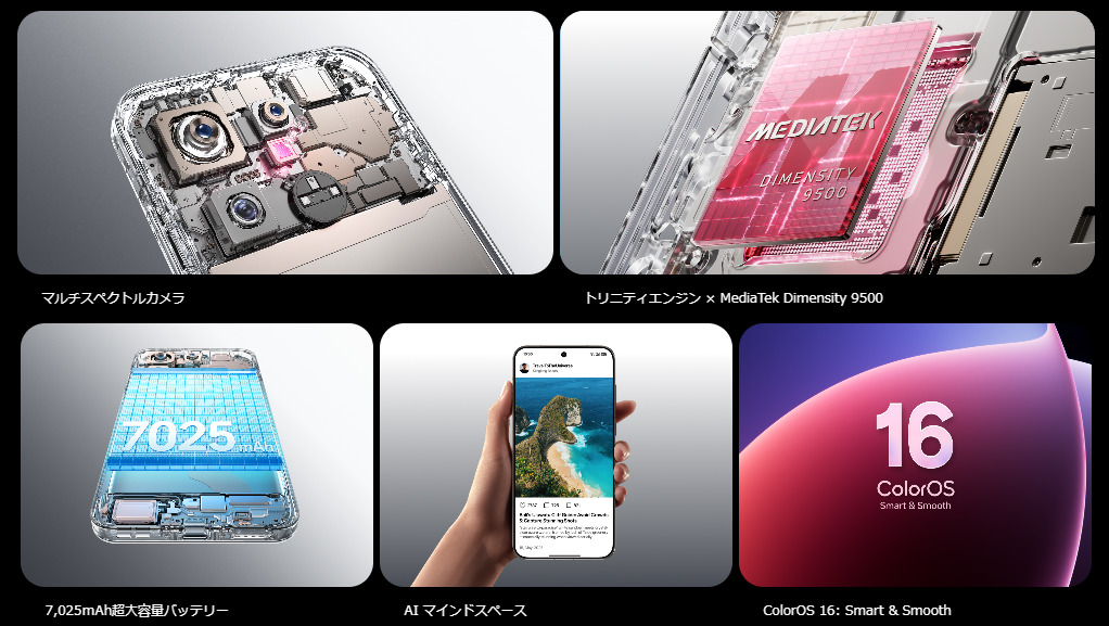 OPPO Find X9は、Snapdragon 8 Elite Gen 5と並ぶ高性能チップセットであるDimensity 9500搭載機となります。