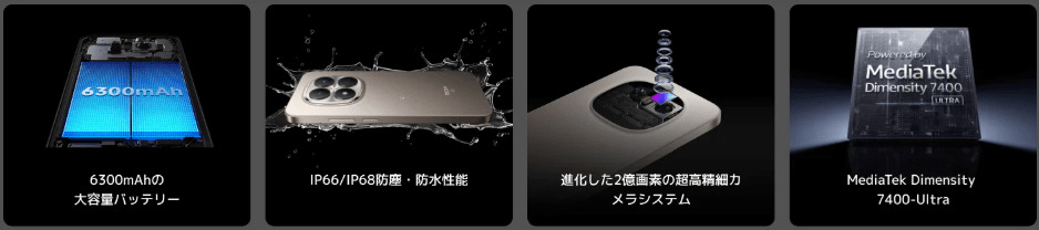 | その他 | 画面内指紋認証センサー搭載・IP66防水防塵・デュアルSIM・microSDXC対応 |